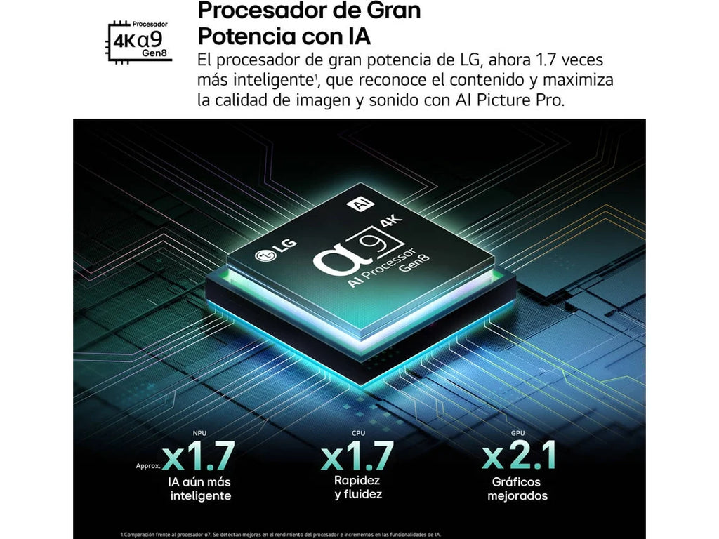 - El procesador de gran potencia, ahora 1.7 veces más inteligente⁽⁵⁾ (4K α9 Gen8), preparado para incorporar las novedades de la IA. Maximiza la calidad de imagen y sonido, trabajando en los 33 millones de puntos de luz independientes a través de la Intelig