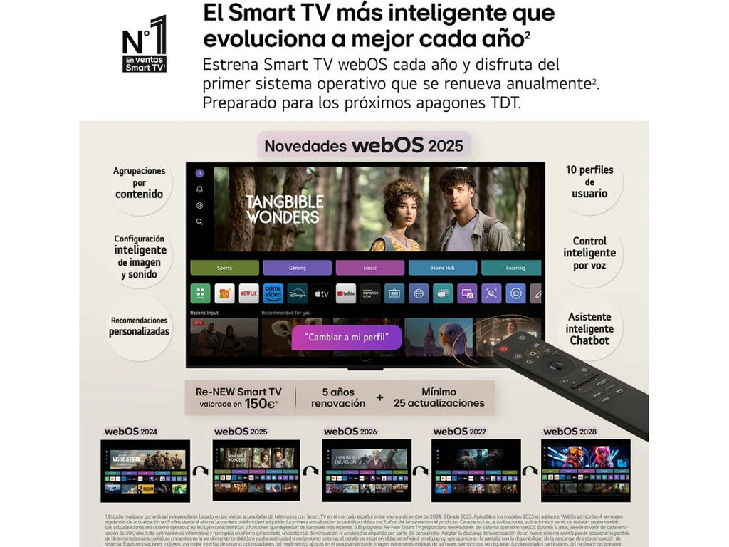 - Smart TV webOS 25 que evoluciona a mejor cada año renovándose en tu TV e incorporando las nuevas funciones de la IA y que está preparado para próximos apagones TDT⁽³⁾. Más inteligente para una personalización y un control del hogar avanzados⁽⁴⁾: reconocim
